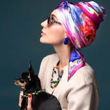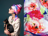 This fuchsia color enriched flowery silk scarf is an eye-catching beauty bomb! Perfect for tying around neck or wearing it sexy on your head, wrapped around your head matryoshka-style.