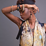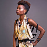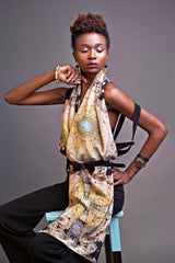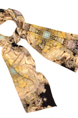 GOLDEN ROMAN FOUNTAIN silk shawl's pattern takes its inspiration from Fontana dei Quattro Fiumi (Fountain of the Four Rivers), located in Piazza Navona in Rome. Perfect for tying around neck or wearing it sexy on your head.