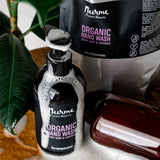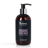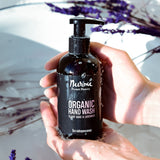 Organic hand wash is packaged in a wide-bottomed bottle with a pump that is ideal in a kitchen or bathroom.