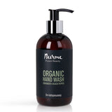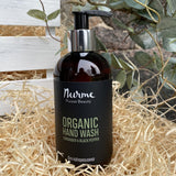 Organic hand wash is packaged in a wide-bottomed bottle with a pump that is ideal in a kitchen or bathroom.