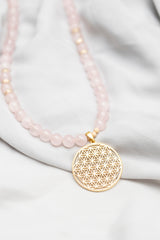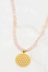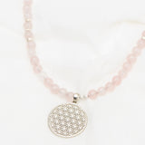 Responsibly made 3D printed ethical 925 silver or gold covered silver and rose quartz necklace.