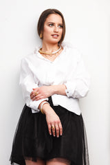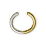 The bangle is bent from a copper tube plated with silver and gold. The open part of the bangle is 3 cm. It is possible to make the open part wider or narrower by bending it.