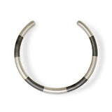 The necklace is bent from a copper tube plated with silver and oxidised. The open part of the necklace is 8 cm. It is possible to make the open part wider or narrower by bending it.