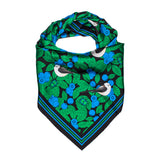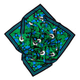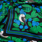Silk scarf with blueberries and long-tailed tits on the black background. Designed in Estonia.