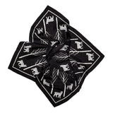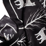 Silk scarf with blueberries and long-tailed tits on the black background. Designed in Estonia.
