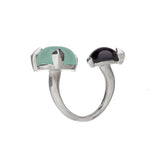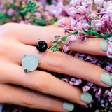 See kohandatava suurusega sõrmus on julge ja elegantne samaaegselt. Kasutatud on jõudu andvat musta oonüksit ning peibutavat mündise alatooniga helerohelist kaltsedoni.
