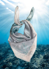 Rätil on hallil taustal akvarellvärvides lainelised kaheksajala kombitsad, mida taustal sekundeerivad meditatiivselt hõljuvad meduusid. Siidirätik sobib suurepäraselt sinu järgmiseks suvepuhkuseks sidumiseks pea ümber Audrey Hepburni stiilis, elegantselt kaela ümber või vöökohale, samuti näiteks kotirihmale voldituna.