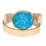 Sky blue druzy agate with gold coloured electroplated sides and dark golden double leather strap make a powerful statement – wether worn on its own or mixed with K.I.S.S. bracelets!